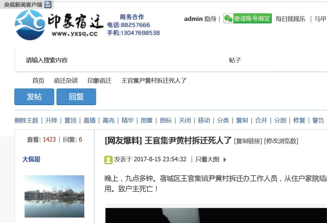 发布所谓“举报”材料的是一个名叫“印象宿迁”的地方性论坛。网站信息显示,这个创办于2016年的论坛,归属于宿迁一家传媒公司,在当地小有名气。小张找到这家公司的负责人杜某,要求立即删除这封“举报信”。